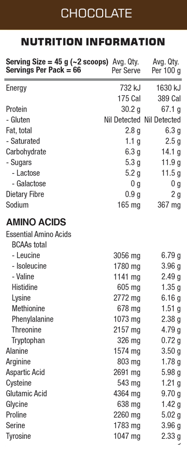 Containing a massive 30g protein per serve - it's ideal for muscle growth and recovery and for high protein diets. Each serve is low fat and low sugar, while being high in Essential Amino Acids and BCAAs. Best of all is the taste and texture. Available in a delicious and creamy chocolate or vanilla.