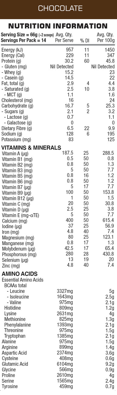 Chocolate Flavour: Native Protein Blend [PUREnWPI® (Native Whey Protein Isolate)(Milk), PUREnMCC® (Native Micellar Casein Concentrate)(Milk)], Prebiotic Maize Fibre, Maltodextrin, Thickeners [Maize Starch, Xanthan Gum (Soy), Guar Gum], Cocoa Powder^, Medium Chain Triglycerides, Coconut Cream Powder (Milk), Natural Flavours, Salt, Vitamins (A, B1, B2, B3, B5, B6, B7, B9, B12, C, D3, E), Minerals (Calcium, Chromium, Iodine, Iron, Magnesium, Manganese, Molybdenum, Selenium, Zinc), Digestive Enzymes (Bromelain, Papain), Sweeteners (Acesulfame K, Sucralose).